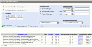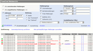Störmeldungen, Betriebsmeldungen und freie Meldungen werden im Meldearchiv des FlowChief Prozessleitsystems gespeichert.